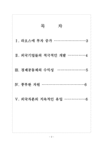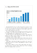 목차 목 차 Ⅰ. 라오스에 투자 증가 3 Ⅱ. 외국기업들의 적극적인 개발 4 Ⅲ. 경제공동체의 수익성 5 Ⅳ. 풍부한 자원 6 Ⅴ. 외국자본의 지속적인 유입 6 본문 Ⅰ. 라오스에 투자 증가 월스트리트저널(WSJ)은 라오스가 미개발 지역인 만큼 성장 가능성이 커 외국인 직접 투자가 지난 2년간 매년 40% 넘게 증가했다고 30일(현지시간) 보도했다. 라오스 전반에 부정부패가 아직 만연해 있고 외국 투자자들의 신뢰도가 낮지만 투자 자금은 계속 늘어나고 있는 추세다. 라오스에 대한 외국인들의 투자는 갈수록 늘어나고 있는 추세이다. 위의 차트에서 살펴볼 수 있는 것처럼 지속적인 증가세를 나타내고 있다. 외국자본이 라오스에 투자를 확대함에 따라서 경제발전을 촉진시키고 있는 것이다. 최근 들어서 동남아시아 지역에 대한 매력성이 부각되면서 이들 지역에 투자가 확대되고 있는 상황이다. 인건비가 저렴하고 자원이 풍부하기 때문에 이들 지역에 투자함으로서 상당한 이익창출이 가능하다. 참고문헌 참고자료 http://www.hankyung.com/news/app/newsview.php?aid=2013013194621 <한국경제> http://www.ajunews.com/common/redirect.jsp?newsId=20130213000373 <아주경제> http://news.heraldcorp.com/view.php?ud=20130205000282&md=20130208005106_AN <헤럴드경제> http://www.etoday.co.kr/news/section/newsview.php?idxno=686789 <이투데이> http://www.kookje.co.kr/news2011/asp/newsbody.asp?code=0300&key=20130204.22010205702 <국제신문> http://view.asiae.co.kr/news/view.htm?idxno=2013012910325110765&nvr=Y <아시아경제> http://www.e2news.com/news/articleView.html?idxno=68363 <이투뉴스> http://www.ajunews.com/common/redirect.jsp?newsId=20130207000470 <아주경제> http://news.kukinews.com/article/view.asp?page=1&gCode=eco&arcid=0006881541&cp=nv <쿠키뉴스> http://www.newstomato.com/ReadNews.aspx?no=332491 <뉴스토마토> 하고 싶은 말 라오스경제 라오스시장의 성장과 향후전망 보고서 키워드 라오스, 라오스경제, 라오스시장, 라오스경제전망 |