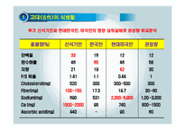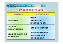 목차 1. 고대(古代)의 식생활 2. 수집과 사냥의 시대에서 생산에 의한 식품의 확보시대 3. 1400~1800년대 세계인의 식생활 4. 근대화와 현대 식생활 5. 우리나라 식탁에서 밥의 위치 변화 6. 현대 대한민국의 식사형태 7. 아침식사의 기여도의 변화 8. 현대인의 식품 및 음식 선호 경향 9. 생활양식 변화와 현대인의 건강 본문 6. 현대 대한민국의 식사형태 ㆍ끼니의 개념이 희박해짐 ㆍ가족간의 식사를 통한 유대감이 약해짐 ㆍ가족간에 식성 차이를 보임 ㆍ식당과 부엌의 넓이 축소 ㆍ가정식사 빈도 감소 - 외식, 간이식 증가 ㆍ배고픔을 못 참고 즉각적으로 제공하는 식사요구 ㆍ간편식품의 개발요구 증가 ㆍ현대인의 바쁜 식습관 ㆍ편리를 추구하는 외식형태 ㆍLife style의 변화- 개인 삶의 중시, 여가생활 반영 참고문헌 구난숙, 세계 속의 음식문화, 교문사, 2010 경제기획원, 광공업 통계조사 보고서, 경제기획원, 1997 김미강, 대학생의 식행동이 식이 섭취실태 및 건강상태에 미치는 영향에 관한 연구, 이화여자대학교 석사학위논문, 2001 김혜영ㆍ조영, 식생활과 문화, 한국방송통신대학교, 2012 보건복지부, 1998 국민건강 영양조사, 1999 맛시모 몬타나리(주경철 옮김), 유럽의 음식문화, 새물결, 2001 서경미, 동북아시아 주요 3국의 식행동 패턴 비교 연구, 경기대학교 석사학위논문, 2003 우문호, 세계의 음식과 문화, 학문사, 2004 원융희, 세계의 음식문화, 자작나무, 1999 장재우, 쌀과 육식문화의 재발견, 청목출판사, 2011 Unitwin-Unesco Project저(나경수역), 아시아의 쌀과 문화, 전남대학교출판부, 2003 하고 싶은 말 본 자료는 현재 호텔 및 외식업체의 현장에서 수십년간 근무중인 프로전문가가 만든 자료로써 사회변천에 따른 인간의 식생활 문화에 대하여 상세하게 정리하였고, 오랜기간 심여를 기울여 만든 결과 일반인 특강 및 현 대학교 호텔조리외식계열에 사용되는 최적의 전문 자료임(A+ 점수자료) 키워드 식생활과 문화, 식문화의 이해, 식생활의 구조, 식생활의 형태, 고대식생활, 현대인의 식품선호경향, 생활양식변화, 우리나라 식사형태, 상차림, 식문화 |
