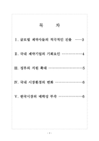 목차 목 차 Ⅰ. 글로벌 제약사들의 적극적인 진출 3 Ⅱ. 국내 제약기업의 기회요인 4 Ⅲ. 정부의 지원 확대 5 Ⅳ. 국내 시장환경의 변화 6 Ⅴ. 한국시장의 매력성 부각 6 본문 Ⅰ. 글로벌 제약사들의 적극적인 진출 약가 인하와 특허 만료 등으로 살림살이가 팍팍해진 국내 제약사들이 앞다퉈 몸집 줄이기에 나서고 있는 반면 유럽 일본 미국 국적의 글로벌 강소 제약사들은 오히려 한국에 거점을 마련하고 새로 둥지를 틀고 있다. 글로벌 제약사들이 국내 시장에 본격적인 진출을 보임에 따라서 향후 제약업계에 큰 변화가 있을 것으로 예상된다. 우수한 역량을 가진 외국 제약기업의 국내시장 진출은 국내 제약기업에게는 위협요인으로 작용하는 일이다. 최근 국내 제약시장은 업체들의 움직임이 활발하지 못했다. 특허기간이 만료되는 약품이 증가하였고 약품 가격이 인하됨에 따라서 높은 수익을 창출하지 못하는 구조가 된 것이다. 참고문헌 참고자료 http://news.mk.co.kr/newsRead.php?year=2013&no=89386 <매일경제> http://biz.chosun.com/site/data/html_dir/2013/02/27/2013022701753.html <조선일보> http://biz.chosun.com/site/data/html_dir/2013/02/27/2013022701774.html <조선일보> http://www.yakup.com/opinion/index.html?mode=view&cat=18&nid=2000131112 <약업신문> http://economy.hankooki.com/lpage/stock/201302/e20130220144443117600.htm <서울경제> http://news.einfomax.co.kr/news/articleView.html?idxno=57844 <연합인포맥스> http://www.ajunews.com/common/redirect.jsp?newsId=20130220000030 <아주경제> http://economy.hankooki.com/lpage/stock/201302/e2013022507533792480.htm <서울경제> http://www.ajunews.com/common/redirect.jsp?newsId=20130219000280 <아주경제> http://medipana.com/news/news_viewer.asp?NewsNum=107278&MainKind=A&NewsKind=5&vCount=12&vKind=1 <메디파니뉴스> 하고 싶은 말 제약산업 글로벌 제약기업의 국내시장 진출상황 보고서 키워드 제약산업, 제약기업, 제약사, 제약업체 |