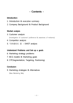 목차 Introduction 1. Introduction & executive summary 2. Company Background & Product Background Market analysis 3. Customer analysis (Investigation of customers preference & awareness of melasma) 4. Competitor analysis 5. '더마화이트 정' - SWOT analysis Understand Problems and Set up a goals 6. Marketing strategy problems 7. BCG models & Marketing goals 8. STP(Segmentation, Targeting, Positioning) Conclusion 9. Marketing strategies & Alternatives (New Marketing Mix) 본문 1. Introduction & Executive summary Currently market size of Korea Beauty is approximately 1.7 trillion won, which includes skin care products, beauty services, cosmetics, skin care shop, Skin Care Clinic. According to the Economic growth and improving income levels, the country s population using the women s skin care is actually a whole 30.2% of women, which is very close to the ratio of Japan developed country aesthetic. Depending on interest in the pursuit of wellness and beauty, we can see the trend that increases population using skin care. According to market research firm AC Nielsen, in 2007 from 46 countries worldwide poll conducted by men and women, the expenditure for skin care was the highest. to invest their own money about 1 person out of three. Like this interest in skin care for men and women is increasing every year and skin care market will expand more and more. Accordingly, skin care services and products to the market competition is increasingly showing signs of overheating, a marketing strategies and techniques here will serve as an important variable. Therefore, our team in the marketing research topics chooses the market of skin care vitamins, medicines that the market scale of 10 billion won based on 2010 fourth quarter. Among that market we choose the melasma treatment medicine field somewhat unfamiliar but recently showing a lot of attention in 30 to 40 woman, and we research the marketing strategies and techniques of melasma treatment medicine that 현대약품 '더마화이트 정'. The market of skin care vitamins, medicine s growth potential is very unlimited market and especially, forward korean market is more bigger than ever before. So we ll analysis the products that current melasma treatment medicines ,their marketing problem and search for specific market strategies. 키워드 마케팅문제, 더마화이트, 마케팅, DermaWhite |