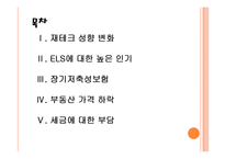 목차 목 차 Ⅰ. 재테크 성향 변화 Ⅱ. ELS에 대한 높은 인기 Ⅲ. 장기저축성보험 Ⅳ. 부동산 가격 하락 Ⅴ. 세금에 대한 부담 본문 Ⅰ. 재테크 성향 변화 금융소득 종합과세 대상인 거액 자산가들은 절세상품으로 월지급식 주가연계증권(ELS)을 가장 선호하고 있는 것으로 나타났다. 이들은 재테크 관련 가장 큰 고민으로 '저금리 지속'을 꼽았다. 위의 표에서 살펴볼 수 있는 것처럼 저금리 현상이 심해짐에 따라서 저축 이외에 다른 수단에 대한 투자가 늘어나고 있다. 저금리 시대로 인해서 저축을 통한 수익 확보가 어려워졌기 때문이다. 국가 경제의 성장이 침체기를 겪으면서 산업에 대한 투자가 활발히 이루어지지 않음에 따라서 기업들의 대출도 축소되고 있는 상황이다. 기업뿐만 아니라 가계의 대출도 과거와 달리 적극적으로 일어나지 않고 있다. 참고문헌 참고자료 http://www.hankyung.com/news/app/newsview.php?aid=2013020487731 <한국경제> http://news.mk.co.kr/newsRead.php?year=2013&no=138238 <매일경제> http://www.nocutnews.co.kr/Show.asp?IDX=2413387 <노컷뉴스> http://news.mk.co.kr/newsRead.php?year=2013&no=138222 <매일경제> http://news.einfomax.co.kr/news/articleView.html?idxno=58184 <연합인포맥스> http://www.edaily.co.kr/news/NewsRead.edy?SCD=JB11&newsid=01882726602713144&DCD=A00201&OutLnkChk=Y <이데일리> http://news.sportsseoul.com/read/economy/1145520.htm <스포츠서울> http://www.hankyung.com/news/app/newsview.php?aid=2013022265246 <한국경제> http://news.heraldcorp.com/view.php?ud=20130222000238&md=20130222094639_AN <헤럴드경제> http://www.nongmin.com/article/ar_detail.htm?ar_id=213822&subMenu=articletotal <농민신문> 하고 싶은 말 저금리 저금리에 따른 영향과 시장변화 PPT자료 키워드 저금리, 저금리문제, 저금리영향 |