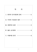 목차 목 차 Ⅰ. 한국의 인사청문회 문제 3 Ⅱ. 미국의 사전검증 철저 4 Ⅲ. 체계적인 절차 5 Ⅳ. 많은 조사항목 6 Ⅴ. 비판여론 방지 6 본문 Ⅰ. 한국의 인사청문회 문제 선진국 가운데 대통령이 지명한 장관 후보자 등을 대상으로 한국처럼 의회가 인사청문회를 가장 철저하게 실시하는 나라는 미국이다. 프랑스 영국 독일 등 주요 선진국들은 의원내각제이거나 이원집정부제여서 의회와 정당 내에서 자체적으로 마련한 검증 과정을 거치고 있다 한국은 관료들이 새로 임명될 때마다 인사청문회 문제로 심각한 어려움을 겪고 있다. 인사청문회는 장관 등의 관료에 대해서 자격을 심사하는 것으로서 인사 대상자에 대한 다양한 인적사항에 대해서 조사를 벌인다. 공직자는 업무수행능력도 중요하지만 도덕성도 중요한 요소로 평가된다. 고위 관직에서 업무를 통해 생산성을 향상시켜야 하기 때문에 낮은 도덕성을 가진 관료일 경우에는 부정부패의 문제가 발생하게 되는 것이다. 참고문헌 참고자료 http://www.hankyung.com/news/app/newsview.php?aid=2013013196941 <한국경제> http://news.sportsseoul.com/read/ptoday/1141665.htm <스포츠서울> http://www.kyongbuk.co.kr/main/news/news_content.php?id=612912&news_area=020&news_divide=&news_local=&effect=4 <경북일보> http://www.yeongnam.com/mnews/newsview.do?mode=newsView&newskey=20130214.010050736460001 <영남일보> http://www.kookje.co.kr/news2011/asp/newsbody.asp?code=1700&key=20130214.22031202809 <국제신문> http://news.inews24.com/php/news_view.php?g_serial=723893&g_menu=050220&rrf=nv <아이뉴스24> http://www.newstomato.com/ReadNews.aspx?no=334367 <뉴스토마토> http://www.newstomato.com/ReadNews.aspx?no=334338 <뉴스토마토> http://news.heraldcorp.com/view.php?ud=20130214000270&md=20130214100251_AN <헤럴드경제> http://news.chosun.com/site/data/html_dir/2013/02/14/2013021400237.html <조선일보> 하고 싶은 말 인사청문회 인사청문회 문제와 개선방안-미국사례 보고서 키워드 인사청문, 인사청문회, 인사청문회문제, 미국인사청문회 |