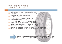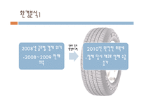목차 선정 동기 및 기업소개 연혁 광고영상 환경분석 SWOT분석 STP 분석 마케팅 믹스(4P) 경영 전략 경쟁사 분석 향후 전략 본문 선정동기 및 기업소개 대한민국 최초ㆍ최대ㆍ최고의 타이어 기업 1941년 한국 최초 타이어 회사 2006-2010 5년 연속 세계 7위 10년 동안 연평균 13.9%의 매출 성장률 현재 4개의 지역본부와 27개국의 지ㆍ법인 글로벌 판매 네트워크를 구축하여 전 세계 180여 개국에 공급 환경분석3 중국 자동차 및 타이어 시장의 높은 성장세 중국 자동차 시장 세계1위→타이어 시장도 크게 성장 세계 타이어 업체들 중국에 투자 한국타이어 매출 중 70% 중국이 차지 키워드 한국타이어, 마케팅, 타이어, 경영학, 환경분석, SWOT분석, STP 분석 |