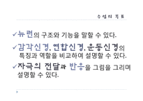 목차 1.지난 수업 시간에 무엇을 배웠을가? 2.수업의 목표 3.선수는 어떻게 날아오는 공을 잡았을까? 4.뉴런 5.뉴런에서 자극 전달 방향 6.생각해보기Ⅰ 7.뉴런의 종류와 특징 8.생각해보기Ⅱ 9.자극의 전달과 반응 10.정리하기 본문 수업의 목표 뉴런의 구조와 기능을 말할 수 있다. 감각신경, 연합신경, 운동신경의 특징과 역할을 비교하여 설명할 수 있다. 자극의 전달과 반응을 그림을 그리며 설명할 수 있다. 뉴런 신경세포체 : 핵과 세포질을 포함하는 부위이다. 가지돌기 : 신경 세포체에서 뻗어 나온 돌기로 자극을 받아들인다. 축삭 돌기 : 가지 돌기에서 받아들인 자극을 인접한 뉴런으로 전달한다. ①뉴런이 세포라는 것은 어떻게 알 수 있을까? 예) 핵을 갖고 있다. ②뉴런이 일반 동물 세포와 다른 점은 무엇인가? 예) 모양이 다르다., 돌기가 있다.(가지돌기, 축삭돌기), 길이가 길다. 등 키워드 뉴런, 신경, 돌기, 자극, 가지돌기, 교육, 생물교육, 수업지도안 |