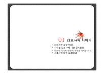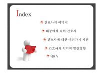 목차 간호사의 이미지 대중매체 속의 간호사 간호사에 대한 여러가지 시선 간호사의 이미지 발전방향 Q&A 본문 간호사 이미지 형성에 영향을 미치는 요인 간호사와 환자의 관계 (직접적) : 간호사로부터 받은 돌봄이 인상적이었던 환자는 간호사에게 긍정적인 이 미지를 갖게 되고, 불친절하다고 느꼈을 경우에는 간호사에 대한 부정적 인 이미지를 갖게 된다. 대중매체 (간접적) : 대중매체에서 나타나는 간호의 이미지는 사회적 관심을 집중 시키고, 사회적 여론을 유도하는데 절대적인 힘을 가지고 있다. ex) 텔레비전 : 변화하는 간호의 전문적 상황을 제대로 반영하지 못하고 있으 며, 전통적 간호사에 대한 좋은 느낌과 신뢰감마저 낮추게 한다. (절대적 복종, 관대, 순응적, 유순함, 정체성, 인간주의, 가족애) 영화 : 대부분 수동적 간호만을 하는 간호사의 이미지를 나타낸다. 참고문헌 -고명숙 외/ 간호학개론/ 수문사/ 2011 -김혜숙/ 간호학개론(전문직론)/ 현문사/ 2000 -이정아, 배정이/ 간호사 이미지에 관한 조사 연구/ 인제대학교/ 2004 -김형자, 김형옥/ 간호사 이미지에 관한 연구/ 전북대학교/ 2000 -도나 윌크/ 간호사 프로를 꿈꿔라!/ 한언출판사/ 2005 -유해영 외/ 병원이 선택하는 탁월한 신입간호사 1%/ 2009 -굿모닝닥터, '함께 일하고 싶은 간호사' 설문조사 -한국갤럽, 대한간호협회, '간호사이미지' 여론조사 -뉴스엔 기사 : '영광의 재인'까지 거듭되는 간호사 비하 논란 '간호사들 뿔났다' (2011.10.19) -데일리메디 기사 : 엽기적인 대만 병원광고(2009.02.09) -나우뉴스 기사 : "섹시한 간호사 뽑아요" 스웨덴 병원광고 논란(2012.02.25) -tv report 기사 : 내년 브레인 뛰어넘는 메디컬 드라마 쏟아진다 (2011.12.28) -대한간호협회 http://www.koreanurse.or.kr 키워드 간호학, 간호사, 인식 |