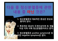 목차 영화소개 및 줄거리 주요인물 소개 성격발달과 특성 정신증상 방어기제 의학적 진단 간호 진단 영화가 우리에게 주는 메세지 본문 다음 중 정신분열증에 관한 내용 중 아닌 것은? 1. 정신분열증의 대표적인 증상은 망상과 환각이 있다. 2. 특징적인 증상이 두개이상이며 육 개월 이상 지속 시에 정신분열증이라고 본다. 3. 정신분열증은 positive symptom은 있지만 negative symptom은 없다. 영화 소개 및 줄거리 제 2의 아인슈타인, 혜성처럼 나타난 20살의 천재 40년대 최고의 엘리트들이 모이는 프린스턴 대학원에 시험도 보지 않고 장학생으로 입학한 웨스트 버지니아 출신의 수학과 천재, 존 내쉬. 뛰어난 두뇌와 수려한 용모의 그는 어느 날 들른 술집에서 금발 미녀를 둘러 싸고 벌이는 친구들의 경쟁을 지켜보던 중 섬광같은 직관으로 균형이론 의 단서를 발견, 1949년 27쪽 짜리 논문을 발표하여 제 2의 아인슈타인으로 떠오름. 참고문헌 영화 『뷰티풀 마인드』 이광자 외, 정신간호총론, 수문사, 2011 키워드 정신분열증, 영화, 뷰티풀 마인드, 성격발달, 간호진단, 방어기제, 정신증상 |