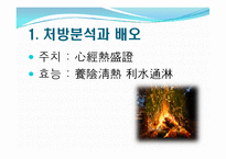 목차 처방 분석과 배오 본초 효능 출전 고방적 분석 후세방적 분석 사상방적 분석 유사 처방 비교 현대적 응용 Case study 본문 2. 본초효능 木通 (利尿通淋藥) 기원 : 으름덩굴과, 으름나무 성미 : 寒, 苦 귀경 : 心, 小腸, 膀胱 효증 : 淸熱利尿, 通經下乳 용량 : 12g in 導赤散 生地黃 (淸熱 血藥) 기원 : 현삼과의 여러해살이 풀 성미 : 甘, 苦, 寒 귀경 : 心, 肝, 腎 효증 : 淸熱 血, 養陰生津 용량 : 24g in 導赤散 竹葉 (淸熱寫火藥) 기원 : 벼과 다년생상록교목 성미 : 甘, 寒, 淡 귀경 : 心, 胃, 大腸 효증 : 淸熱除煩, 渗濕利水 용량 : 6g in 導赤散 키워드 한의학, 도적산, 응용, 처방, 분석 |