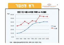 목차 1.Market Analysis 2.Introduction 3.Strategy of MarineHarvest 4.Competitor Analysis 5.Overseas expansion 6.Conclusion 본문 환경분석 Market Structure & Size 세계 수산 시장 '09년 세계 수산물 총생산량은 1억 45백만 톤 세계 양식 시장 양식 수산물 생산량은 55백만 톤으로 전체 생산량의 38%를 점유 2004년 31%에서 해 마다 1%포인트 이상 꾸준히 상승 FAO에서는"2050년까지 어떻게 인류를 먹일 것인가"하는 식량문제를 본격적으로 제기하고 있다. 세계 연어 시장 세계 연어 양식은 1980년 이래로 규모가 급격하게 성장하고 있는중으로 2010년대에는 약140만톤에 이르고 있음 키워드 세계, 수산물, 양식, Market, 시장, MarineHarvest |